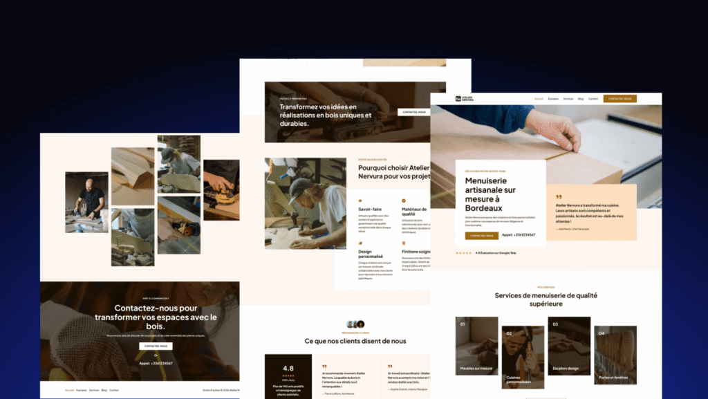 Projet de site web pour une activité de menuiserie sur mesure, conçu pour valoriser le savoir-faire artisanal, mettre en avant les réalisations et inciter à la prise de contact. Une présentation élégante, professionnelle et orientée crédibilité.