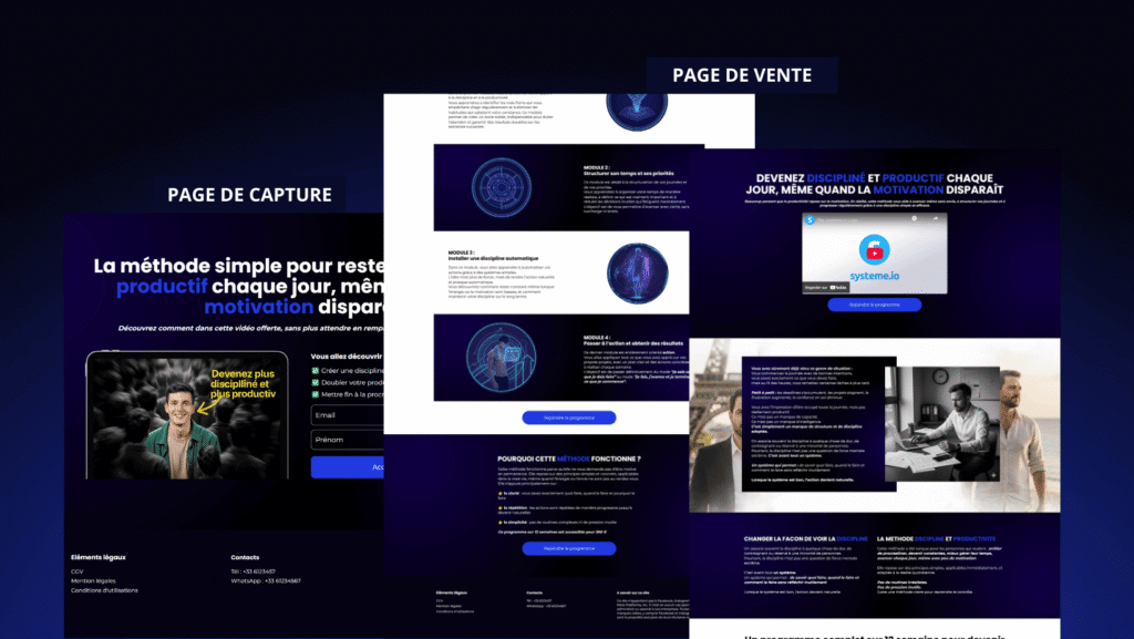 De la capture de leads jusqu’au paiement, chaque étape a été structurée pour maximiser l’engagement, la conversion et le passage à l’action.