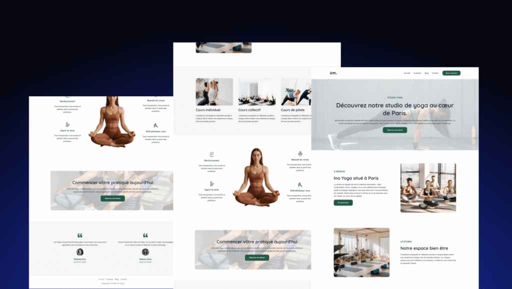 Projet de site web pour un studio de yoga, conçu pour transmettre une atmosphère apaisante, valoriser l’expérience et guider les visiteurs vers la réservation de séances.
